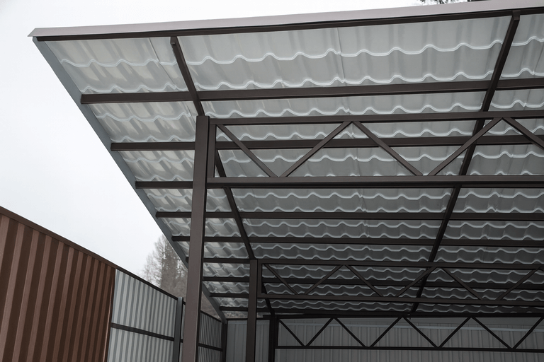 Чем больше площадь перекрытия, тем выше расход материалов и трудозатраты. Для небольших навесов можно использовать облегчённые решения, тогда как для больших потребуются усиленные опоры и фермы. -